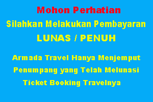 Saran Kami : Jangan melakukan Booking Travel. sebagai agen travel yang mengutamakan Pelayanan Profesional Mudah cepat dan Praktis kami menjanjikan Kepastian bagi Penumpang yang telah Lunas akan dijemput dan diantar sesuai dengan kesepakatan jadwal.